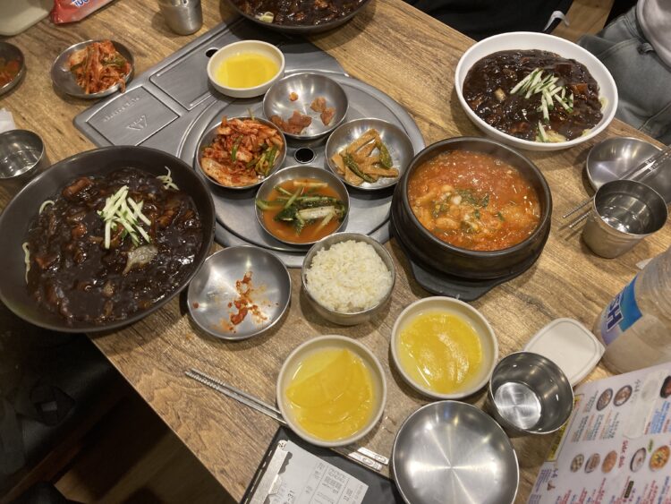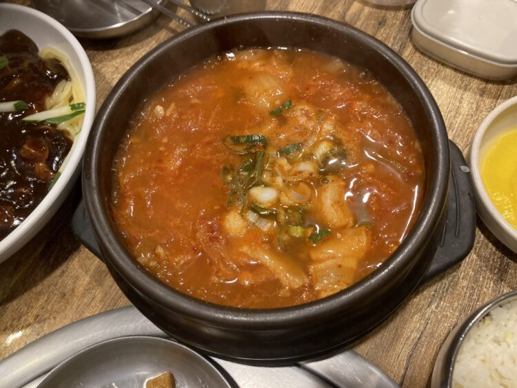 「オモリチゲ」とは書いてないけど、キムチチゲと、韓国人が大好きなチャジャンミョン(ジャージャー麺)をオーダー。