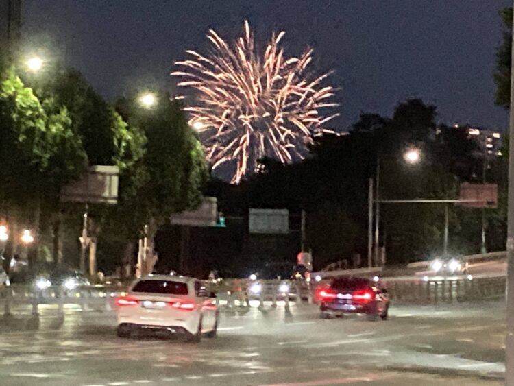 外に出ると花火。