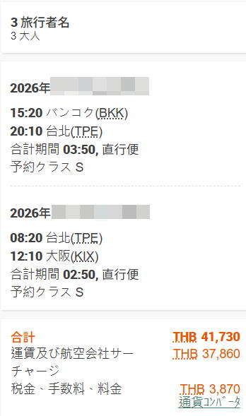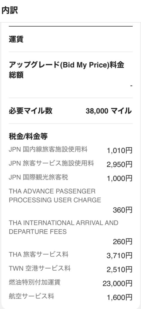 大阪➡バンコク➡台北➡大阪に必要なマイルは、1人38,000マイル。