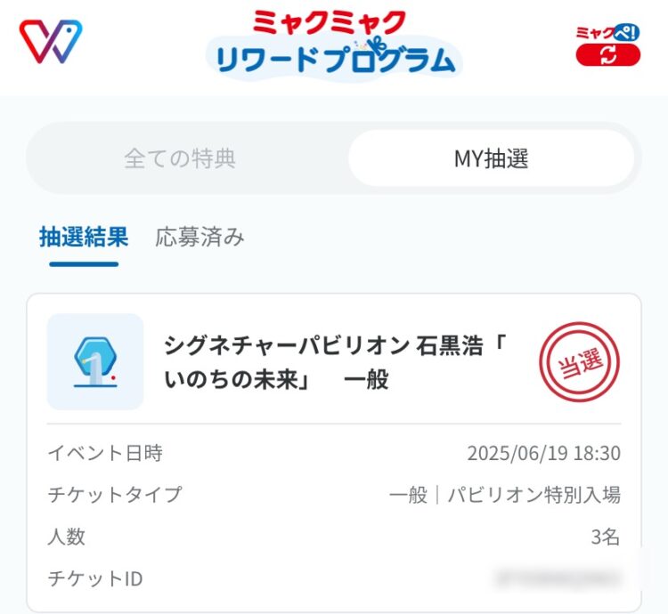 ミャクミャクリワードプログラムで当選。