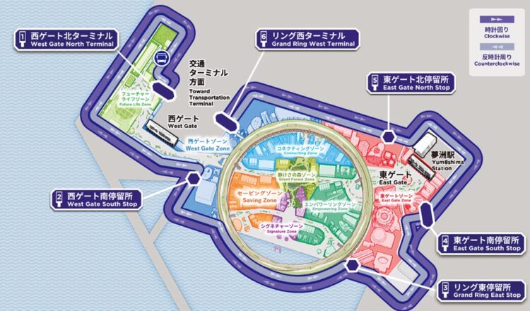パナソニック・ノモの国の奥にある、「東ゲート南停留所」から時計回りに乗れば、Matsuriの近くの「西ゲート北ターミナル」に行けますね。
