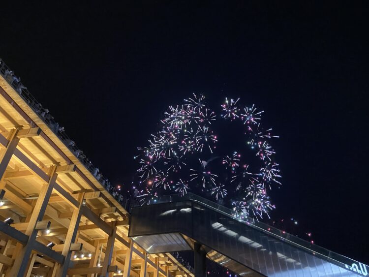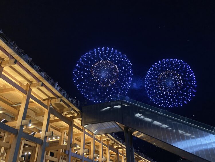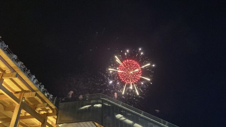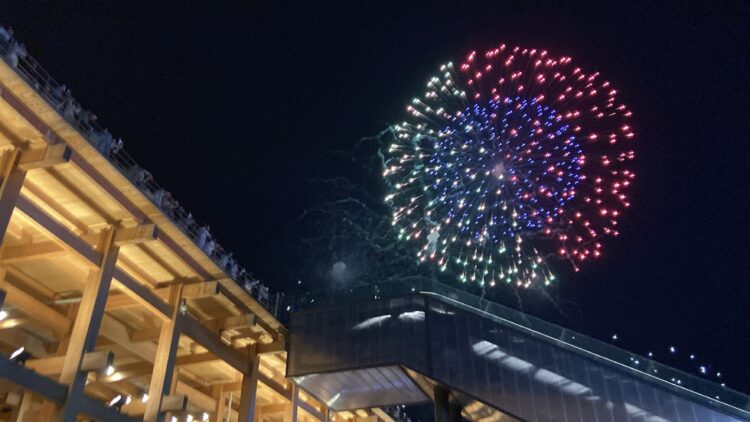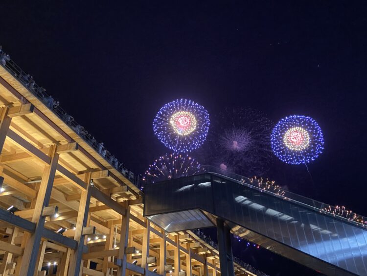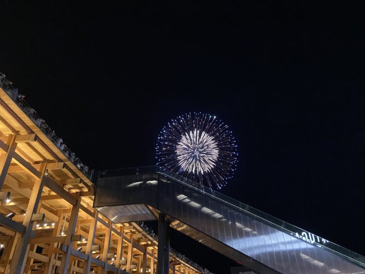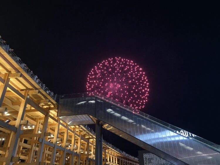 リングに上がるエスカレーターがじゃまなんやけど、逆にリングといっしょに花火が撮れているのはいいかも😁