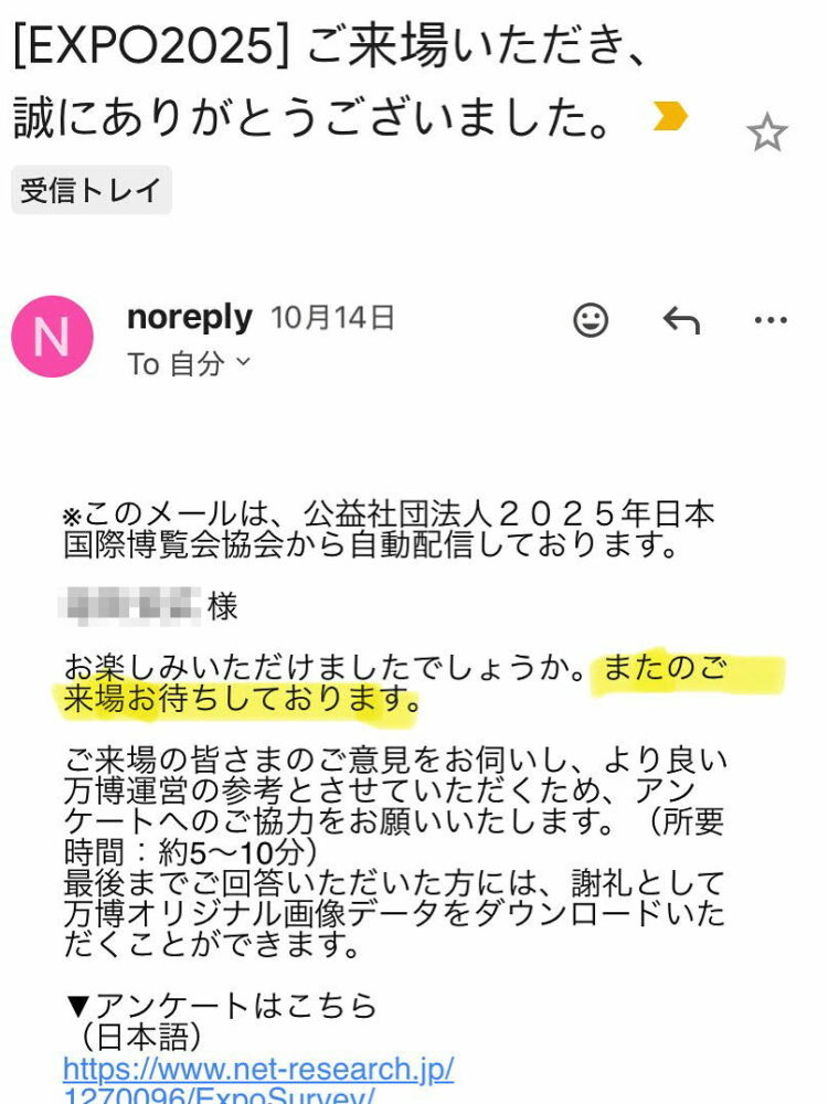 と思いきや、いつも万博に行った後にくるこんなメールが今日も・・・