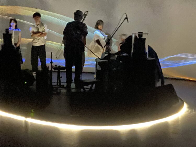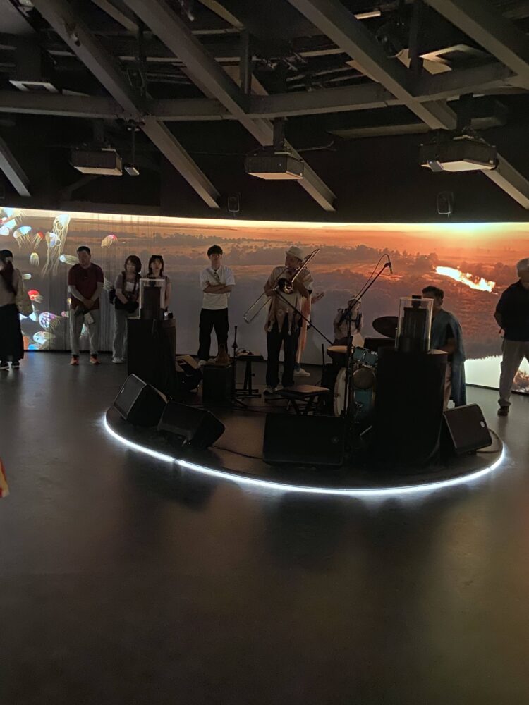 中央で生演奏される音楽に合わせてリアルタイムに反応します。